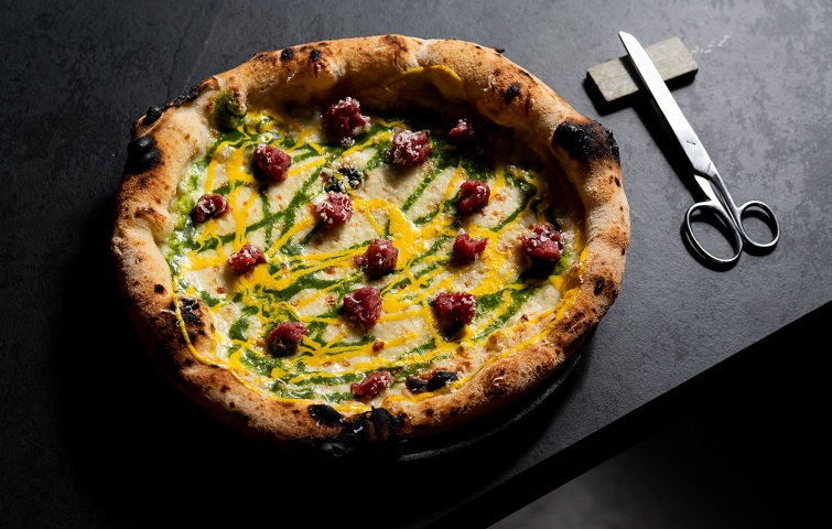 Qui il risotto si trasforma, senza tradirsi. La pizza “Fiordilatte, battuta di manzo, salsa allo zafferano, pecorino e gremolada” prende in prestito colori, profumi e codici milanesi per reinterpretarli in chiave contemporanea. Non è un risotto, ma una dichiarazione d’amore alla città servita su un impasto.
