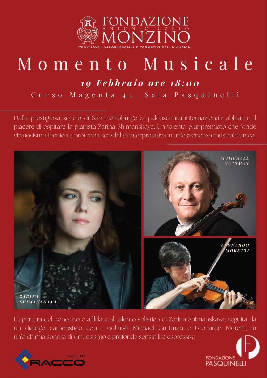 Il prossimo 19 febbraio alle ore 18.00, presso la Fondazione Monzino di Corso Magenta 42 a Milano, si terrà un nuovo appuntamento della rassegna Momento Musicale, con la pianista russa Zarina Shimanskaya affiancata dai violinisti Michael Guttman e Leonardo Moretti.
